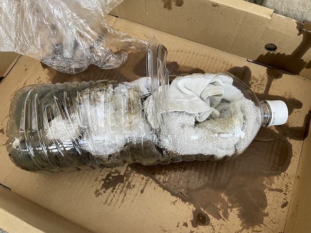 ペットボトルをカッターで大きく切開けて口を作り、タオルを詰め込みます