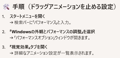 「視覚効果」タブの中で不必要なアニメーション設定のチェックを外して、「OK」ボタンを押します。