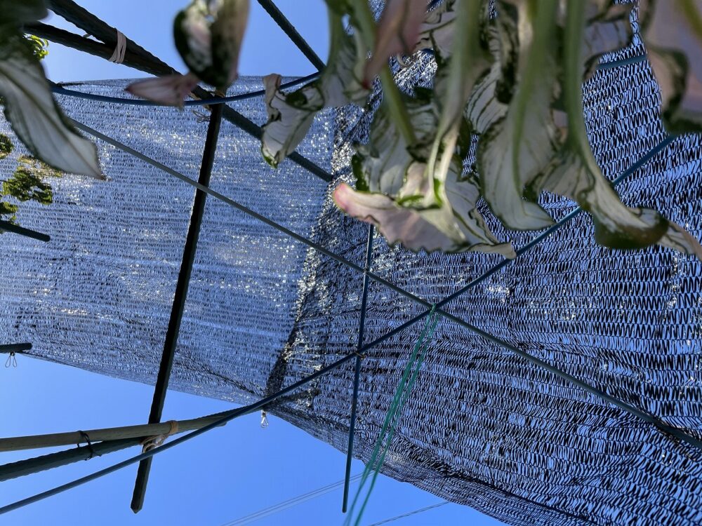 ビニールのトンネルは熱が溜まりやすい懸念があったので、遮光ネットに変えます。