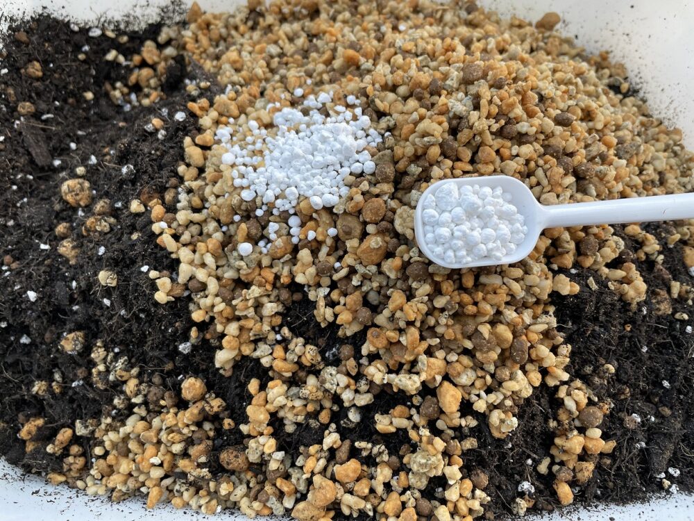花ごころの「花ちゃん培養土」とプロトリーフの「粒状かるーい培養土」を4:1の割合で混ぜました。