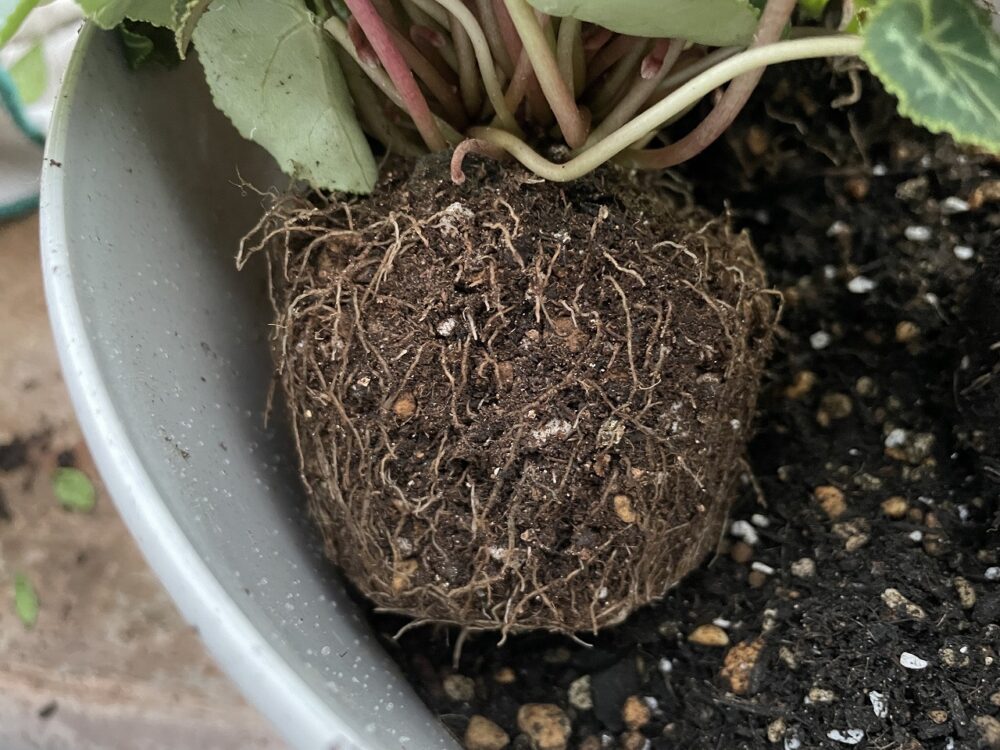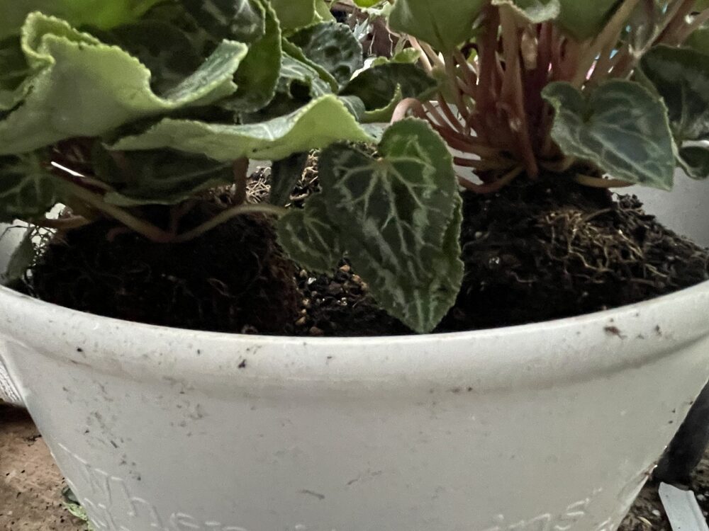 シクラメンは蒸れを嫌うので、(お気に入りの)花ごころさんの土に、鹿沼土と赤玉土主体の培養土を加えて、水はけを良くしています。