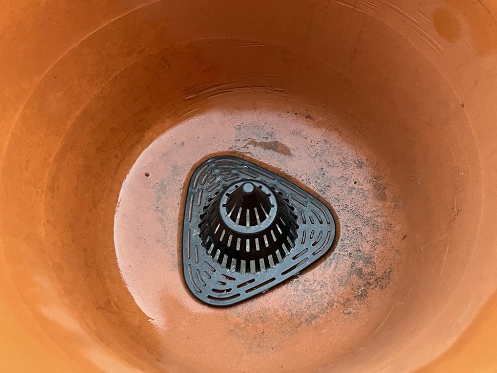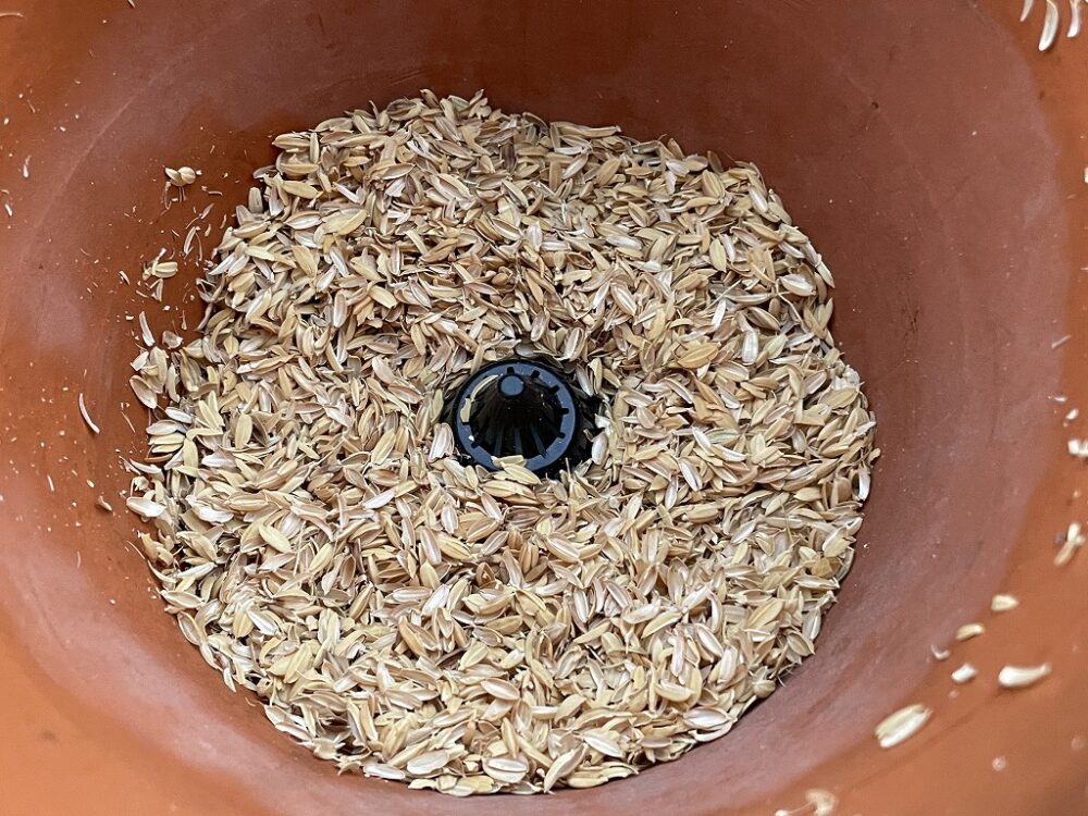 立体的な鉢底網(100均)を使用し、あと、鉢底石がなかったので、急遽、もみ殻で代用してみました。