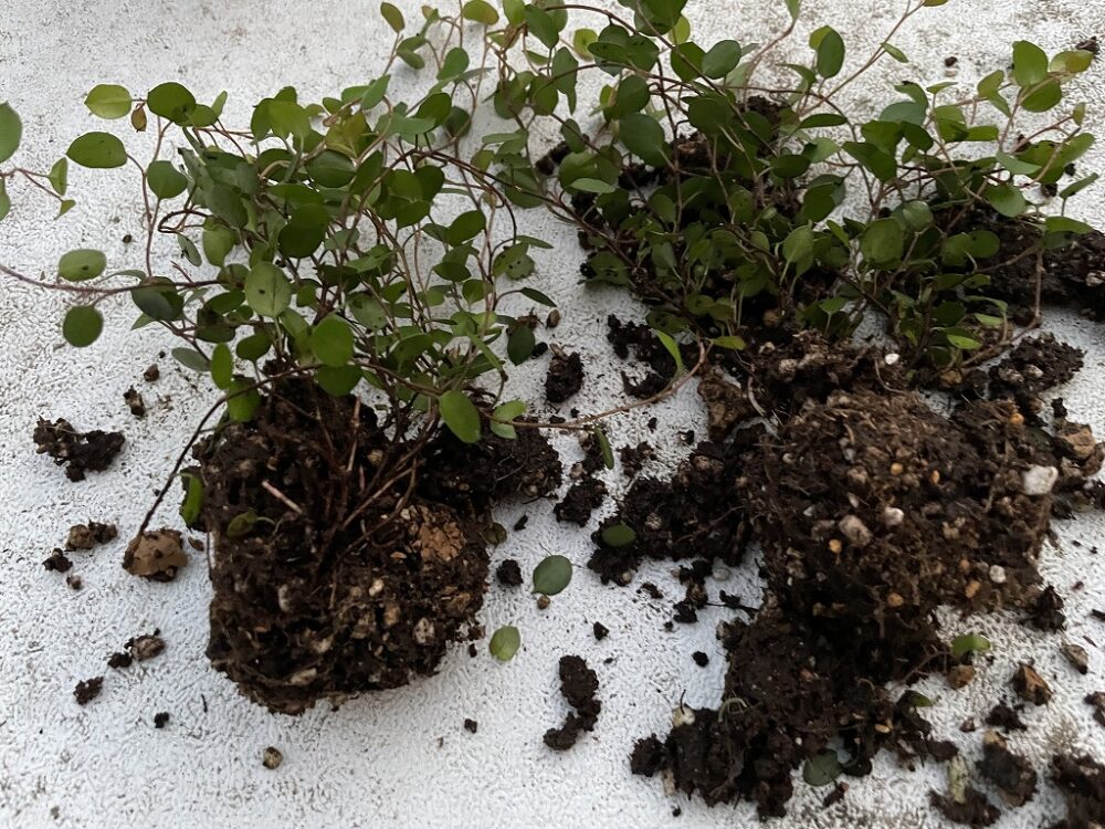 ワイヤープランツは株分けして、半分は別の寄せ植えに使うことにしました。