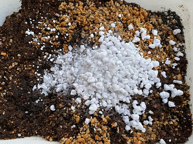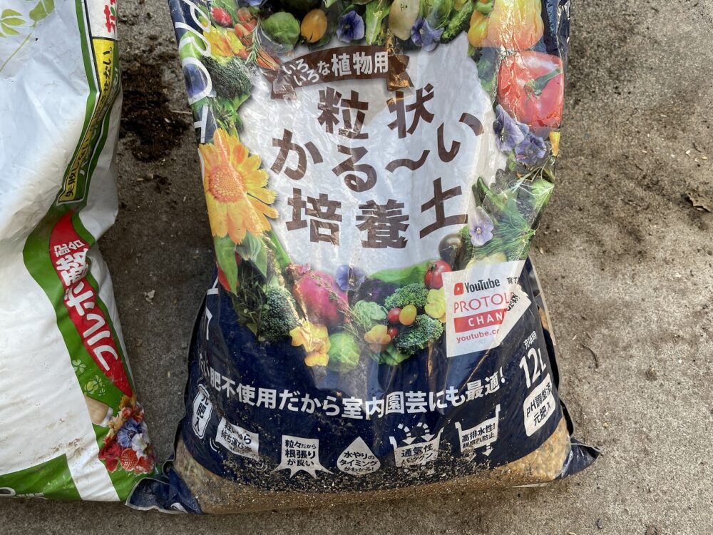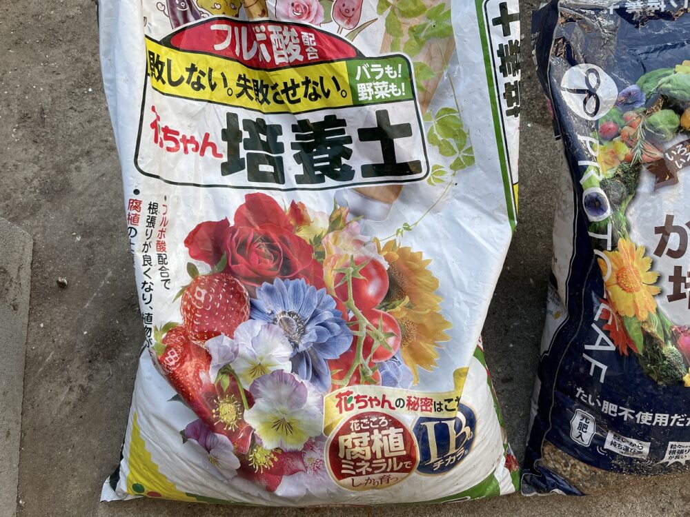 定番の「花ちゃん培養土」と残っていた「粒状かる~い培養土」を4:1程度で混ぜます